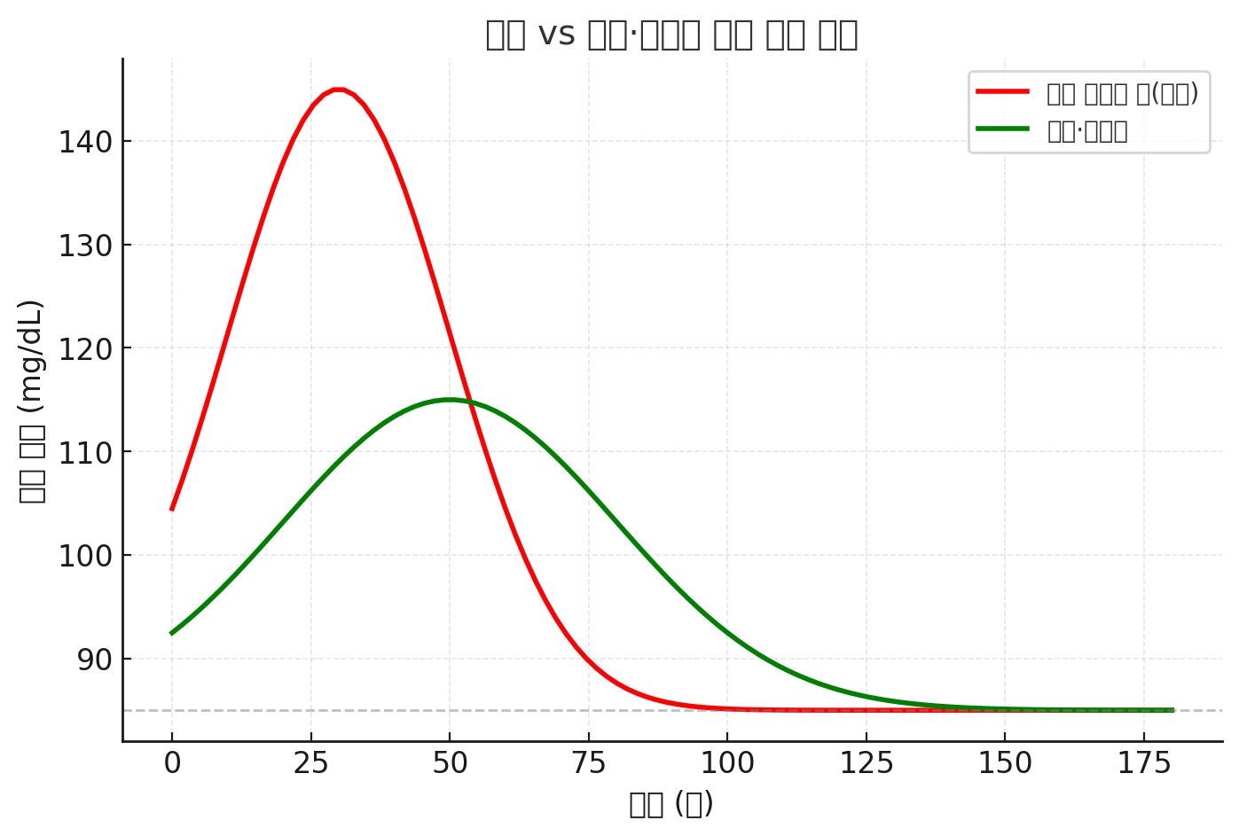 혈당 변화 실험 그래프를 보면 차이는 분명합니다.